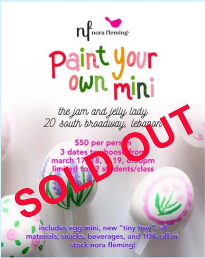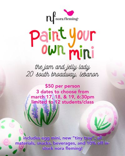 Too cute for words! Nora Fleming iconic servingware (sold at our gift shop) is offering one time only - "paint your own mini egg" classes at chosen retail shops! Class registration includes your mini egg ($18 value), a "teeny" tray ($20 value), materials, beverages, food, music, and fun for your group! Only 12 students per class. Limited time, only!